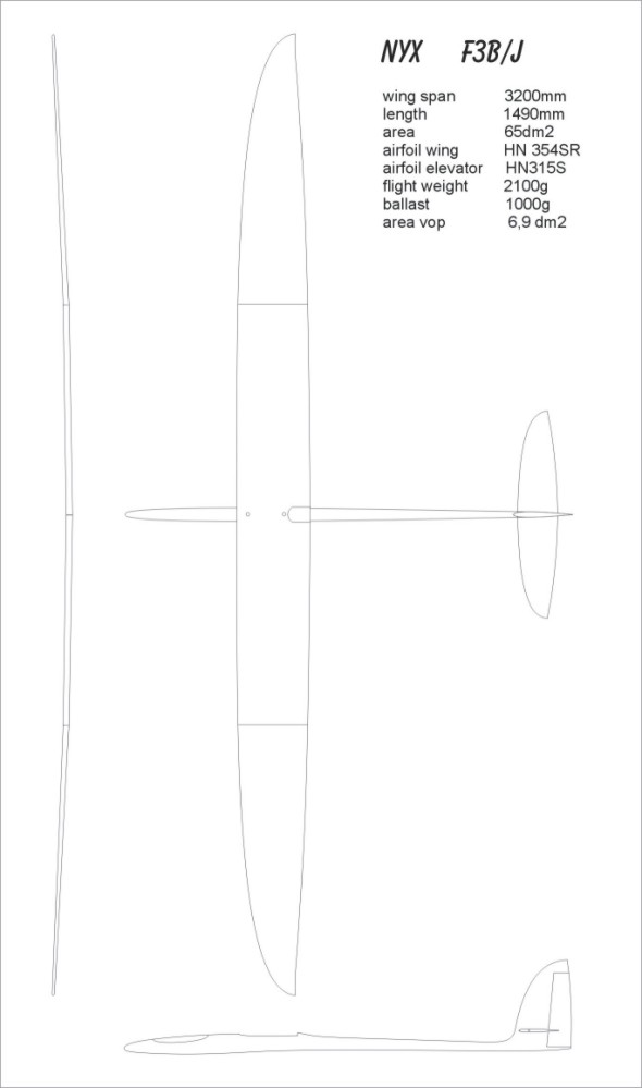 Soaring)/F3J用のニューモデルです。 最近では、ニューモデルが巷にあふれ、どこでも買えるかのように見えますが、これは実態ではないと思われます。今、実際にあるのは、過去何年か前には無かった多様な選択になったということではないでしょうか。ここ数年の傾向として始まったばかりですが、F3FやF3Jモデルの分野では、モールド機設計において、これらの機体に特化した設計が盛り込まれるようになってきました。そしてF3JやF3Fという競技に特化し、そのタスクにおいて秀逸した性能がでるようなスタイルに向ってさらに進化しようとしています。すべてのタスクに優れた性能がでるような設計をすることは、かなり難しいことだからです。一方で、F3B機には、"all-rounder"もしくは、3つのタスクで平均以上の性能をもつことが要求されています。しかしながら、NYXは、これに成功し、サーマル、距離、スピードのすべてに対応できるF3B機です。 (宮川さんの日本輸入初号機へのコメント/2002年1月13日) 2001年末にNYXが日本にも到着しました。上里の宮川さんに初号機のテストをお願いし2002年1月13日に初飛行をしました。結果は、このページの下の方に報告しています。機体の第1印象は、思ったより完成度が高いことです。心配したノーズの強度はノーズコーン方式と比べても十分硬く、定点で地面に差しても大丈夫(?)と思われます。最近のF3B機の主翼は、Estrellaに代表される薄翼、高剛性翼が特徴ですが、NYXの翼型であるHN354SRは、BRETA modelがStarLiteで採用していたSAシリーズの翼型に似ており、薄翼です。剛性については、現在のバージョンではかなり撓むようで、タスクCのターンの時に必要な跳ね返り弾性が若干不足しているようです。メーカは、この件について真摯に対応してくれており、現在、改良版を制作中で、2002年2月あたりから強化版を提供して行く予定です。しかしながら、初飛行のベストタイムは、16秒とのことでした。C-tailは、透けて見えるような尾翼と軽い水平尾翼でした。C-tailと胴体の接続部分のねじれ強度は、かなり強くTasK Cで機体を回転したり、曳航で左右に振る場合でも、不安定さはないと思われます。何よりうれしいのは、全て配線済みで、主翼の9Pinコネクターまでインストールされていることです。詳しくは、下記のコメントをご覧ください。 |
